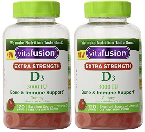 -. Binding : Health and Beauty -. EAN : 0027917008202 -. Feature : Vitafusion Extra Strength Vitamin D-3, 3000 IU, 120 Count (PACK OF 2) / Helps support strong bones and teeth / Helps support your immune system / Natural strawberry flavor / Free of gluten and high fructose corn syrup -. IsAdultProduct : 0 -. Label : Vitafusion -. Manufacturer : Vitafusion -. Model : No Model -. MPN : No MPN -. PartNumber : No MPN -. ProductGroup : Health and Beauty -. ProductTypeName : HEALTH_PERSONAL_CARE -. Publisher : Vitafusion -. Studio : Vitafusion -. Title : Vitafusion Extra Strength Vitamin D-3, 3000 IU, 120 Count (PACK OF 2) -. UPC : 027917008202