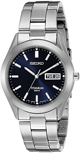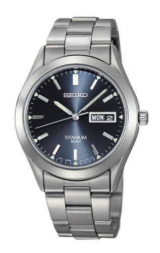 Spruce up your look with this men's titanium watch by Seiko. The blue dial with luminous hands and hour markers lends a striking appearance and the day/ date display offers added convenience. 50 meters water resistant.