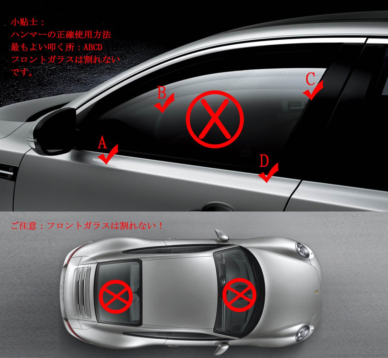 Glass of the right and left windows can be broken with a hammer, as shown in the picture, you can knock the glasses in order, making the glass easier to break.