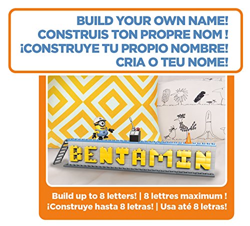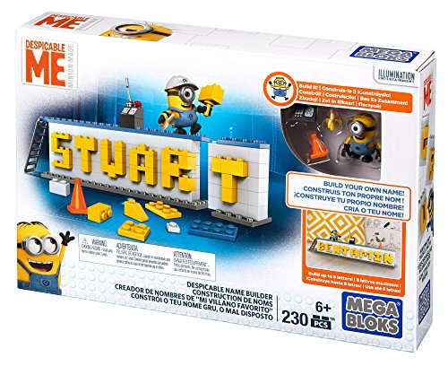 -. Binding : Toy -. Brand : Mega Bloks -. EAN : 0887961344806 -. Feature : Buildable nameplate with Minion-themed colors and accessories / Build up to eight letters long to spell out your name / Buildable Stuart Minion character with interchangeable parts including overalls, goggles, arms and feet / Includes helmet, red cone, ladder and other Minion-themed accessories / Connect with other Mega Bloks Despicable Me name builders to create even bigger words -. IsAdultProduct : 0 -. Label : Mattel -. Manufacturer : Mattel -. Model : DRV32 -. MPN : DRV32 -. PackageQuantity : 1 -. PartNumber : DRV32 -. ProductGroup : Toy -. ProductTypeName : TOYS_AND_GAMES -. Publisher : Mattel -. ReleaseDate : 2016-04-13 -. Studio : Mattel -. Title : Mega Bloks Despicable Me Name Builder Set -. UPC : 887961344806 -. Warranty : 1 year warranty against manufacturer defects