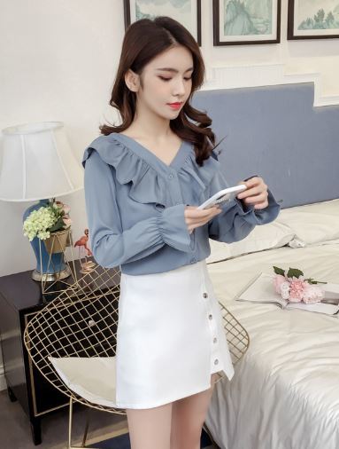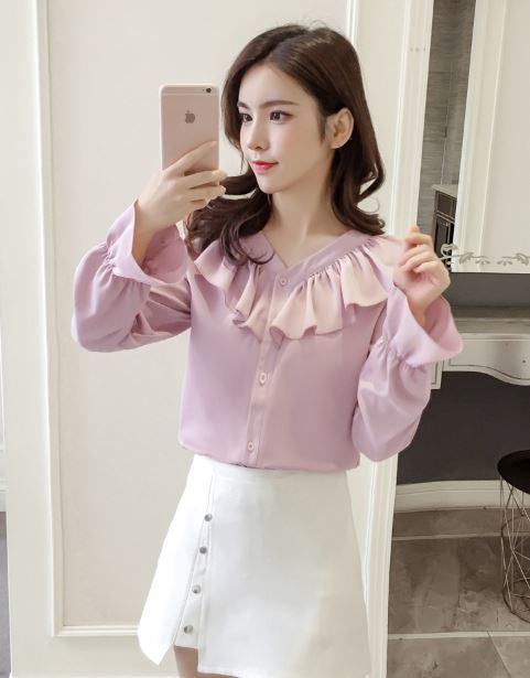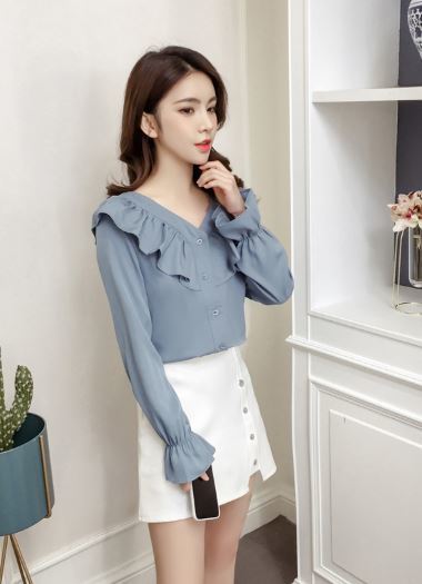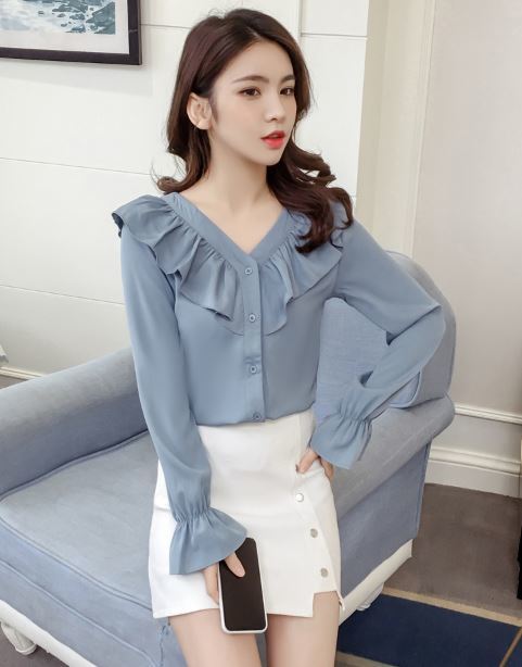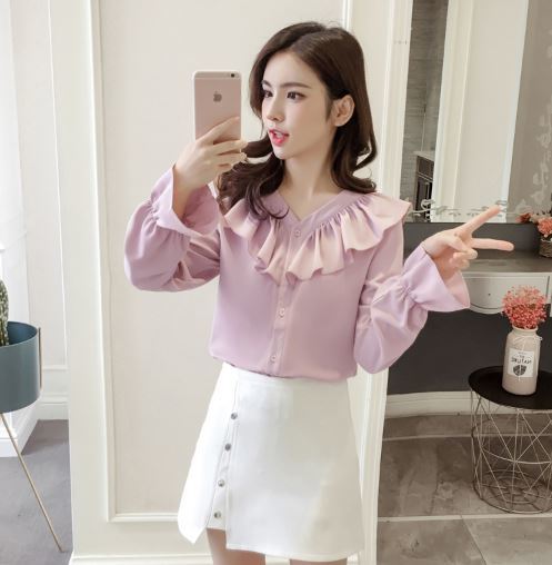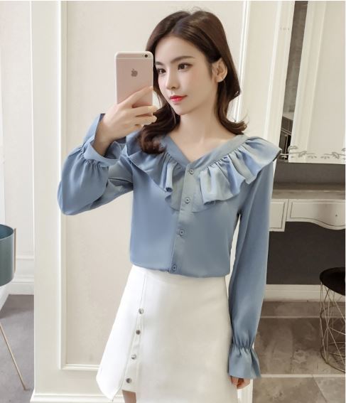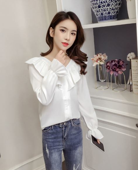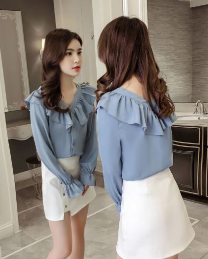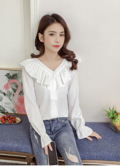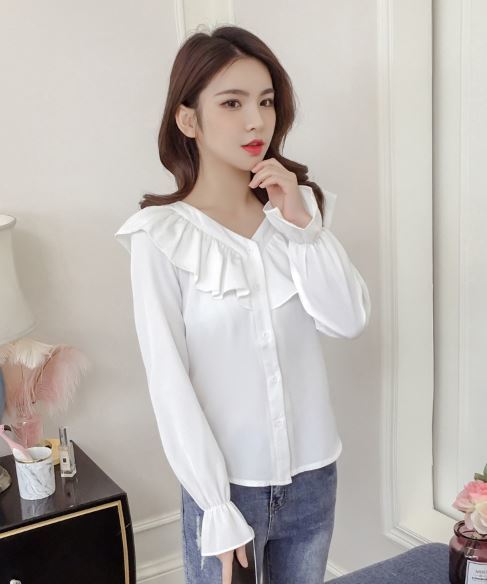襟元と袖の大きめフリルがフェミニンな長袖シャツのご紹介です。