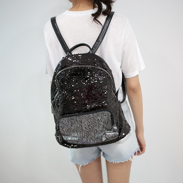 |  하나만 들어줘도 스타일링 포인트가 되어줄 스팽글 백팩을 소개할게요~ 라인감과 입체감이 살아있어 패셔너블하면서 실용적인 가방이에요 바디 전체가 스팽글로 제작되어 더욱 유니크하답니다 탄탄하지만 가벼운 소재라서 활동량이 많은 날, 가벼운 외출 어디에나 편한 착용이 가능해 자꾸만 손이 가실 거에요 적당한 크기의 가방으로 수납이 편해서 데일리백으로 딱이구요 기타 수납이 가능한 포켓이 내,외부에 있어서 그 활용도가 더 높은 가방이랍니다 블랙과 그레이 색상이 준비되어있구요 상세페이지 확인 후 굿 초이스 해주세요!       | COLOR | 블랙 / 그레이 | | 제품 색상은 모니터에 따라 실제 색상과 차이가 있을 수 있습니다. | | | | FABRIC | 스팽글+합성피혁 | | | | PRODUCT ION | 제조국 / 중국 | | 품질보증기준 / 소비자분쟁 해결기준에 따름 | | A/S 책임자 및 고객센터 / 감성가방 | | | | SIZE INFO | 사이즈는 측정 방법에 따라 1~2cm의 차이가 있을 수 있습니다. | | 스트랩 길이는 연결 고리를 제외한 길이이며, 최대 길이입니다. | | (단위:cm, g) | | 가로 길이 | 세로 길이 | 너비 | 손잡이 높이 | 스트랩 길이 | 무게 | | 37 | 34.5 | 15 | 7 | 42(조절o) | 720 |  |