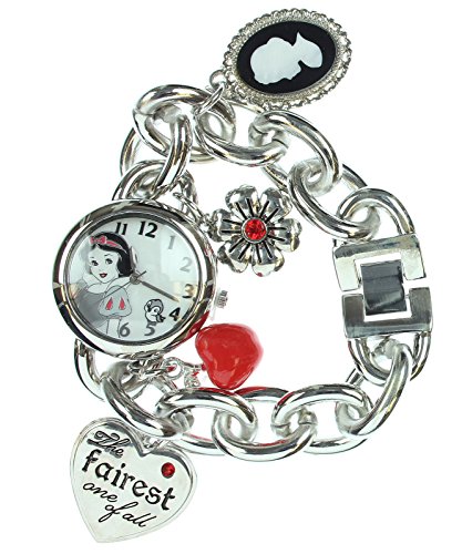 Fairest of them all, red apple, mirror. What do you think about if you notice these things? Yes, it is the Snow White and the Seven Dwarfs. The Snow White image on round shape silver sunray dial, with Arabic numerals. Polish finish bracelet watch with 4 charms hanging from thick charm bracelet, jewelry clasp, is powered by precise Japanese quartz movement.Feature