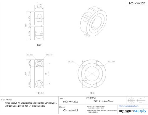 Climax Metal 2C-075-S T303 Stainless Steel Two-Piece Clamping Collar, 3/4" Bore Size, 1-1/2" OD, With 1/4-28 x 5/8 Set Screw