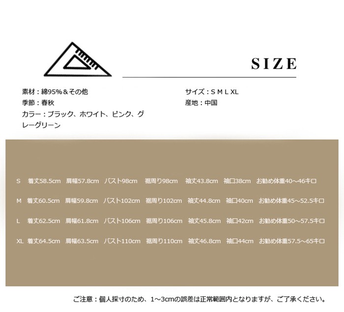 カットソー レディース 長袖 カットソー Tシャツ トップス 大きいサイズ ゆったり ルームウェア アウトドア スウェット 薄て2018新作登場 カットソー Tシャツ レディース 長袖 スウェット 薄て商品詳細素材:綿95%&その他季節:春秋カラー:ブラック、ホワイト、ピンク、グレーグリーンサイズ:S M L XL産地:中国サイズ参照表S 着丈58.5cm 肩幅57.8cm バスト98cm 裾周り98cm 袖丈43.8cm 袖口38cm お勧め体重40~46キロM 着丈60.5cm 肩幅59.8cm バスト102cm 裾周り102cm 袖丈44.8cm 袖口40cm お勧め体重45~52.5キロL 着丈62.5cm 肩幅61.8cm バスト106cm 裾周り106cm 袖丈45.8cm 袖口42cm お勧め体重50~57.5キロXL 着丈64.5cm 肩幅63.5cm バスト110cm 裾周り110cm 袖丈46.8cm 袖口44cm お勧め体重57.5~65キロご注意:個人採寸のため、1~3cmの誤差は正常範囲内となりますが、ご了承ください。カットソー レディース 長袖 カットソー Tシャツ トップス 大きいサイズ ゆったり ルームウェア アウトドア スウェット 薄て2018新作登場 カットソー Tシャツ レディース 長袖 スウェット 薄て