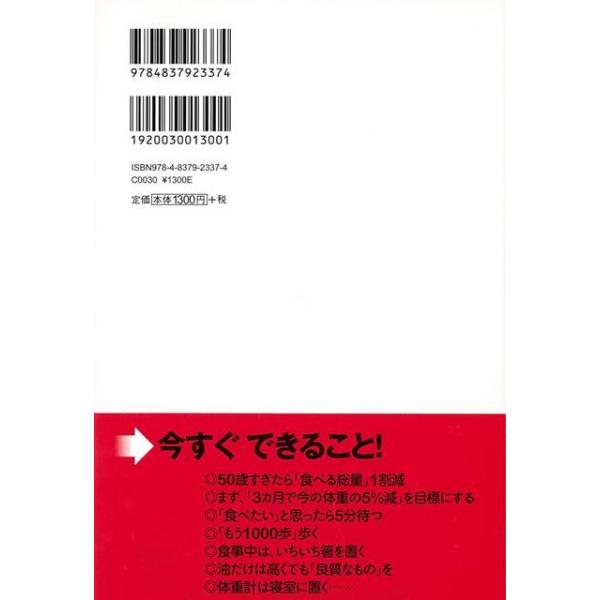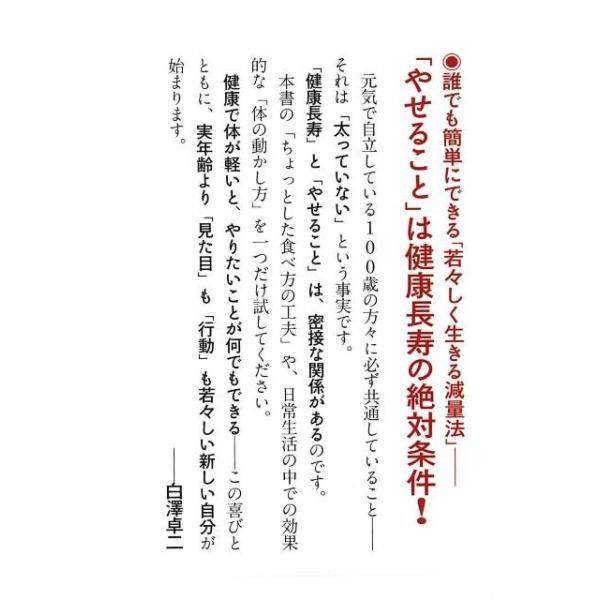 【商品説明】 定価(税込み):1,404円 値引き:10% OFF 元気で自立している100歳の方々に必ず共通していること-それは「太っていない」という事実です。「健康長寿」と「やせること」は、密接な関係があるのです。本書の「ちょっとした食べ方の工夫」や、日常生活の中での効果的な「体の動かし方」を一つだけ試してください。 バーゲンブック 新品 特価 格安 ビューティー&ヘルス 健康法 長寿 生活 健康 ビューティー ヘルス | |