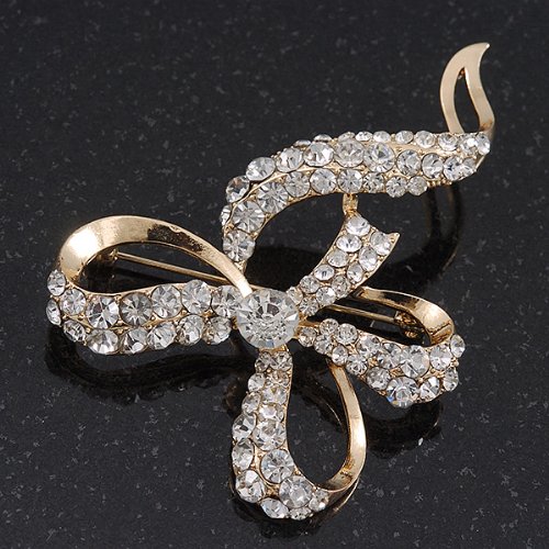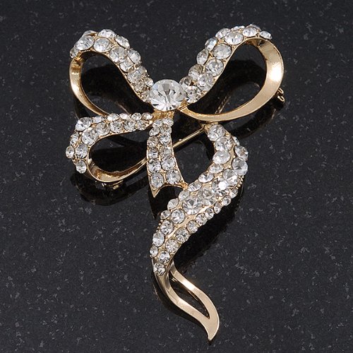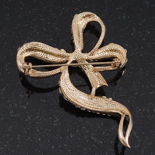 -. Title : Dazzling Diamante 'Bow' Brooch In Gold Plated Metal - 7cm Length