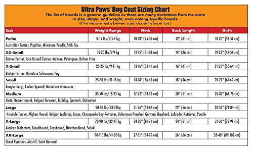 - Feature : SEE IMAGES FOR SIZING CHART / Easy to put on and take off. / Generous adjustable Velcro closures at the neck and belly. / Coat extends from base of neck toward base of tail. / Reflective strips for night time visibility. / Water repellent Supplex outer shell with a warm fleece liner.