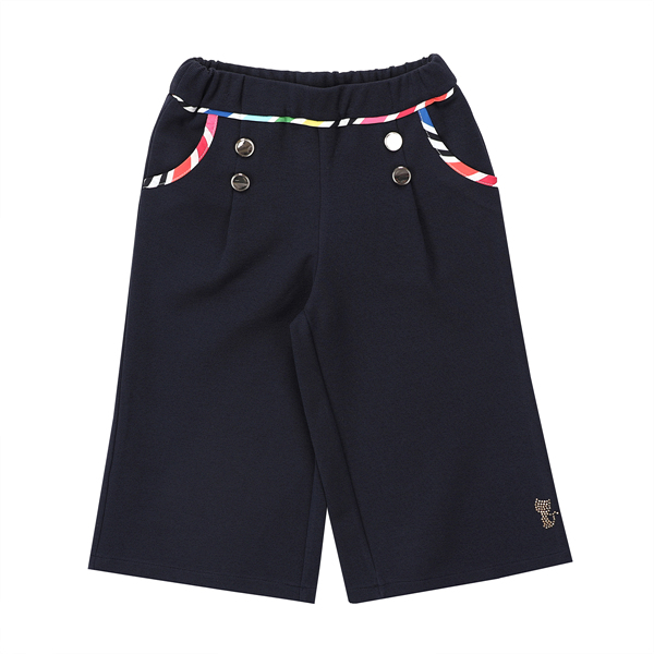 상품설명 네이비 컬러의 와이드 팬츠입니다. 멀티 스트라이프가 배색되어 있어서 네이비 컬러지만 어둡지 않은 느낌으로 연출 할 수 있고, 골드가 블링한 느낌을 주는 단추 장식을 더해주었습니다.
