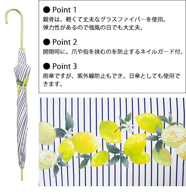 親骨は、軽くて丈夫なグラスファイバーを使用しています。開閉時に、爪や指を挟むのを防止するネイルガード付き。雨傘ですが、紫外線防止もでき、日傘としても使用できます。 |