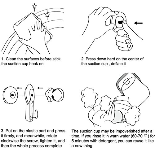 - Installation: 1-Clean the surface; 2-Press down hard on the suction cup, deflate it; 3-Put on the plastic part and rotate clockwise the screw, tighten it; 4-Finish