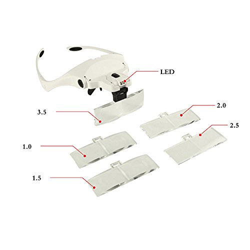- Headset Magnifier with LED Light : The magnifiers has a lamp with 2 LEDs operated with 3 AAA batteries (The batteries not Included ).