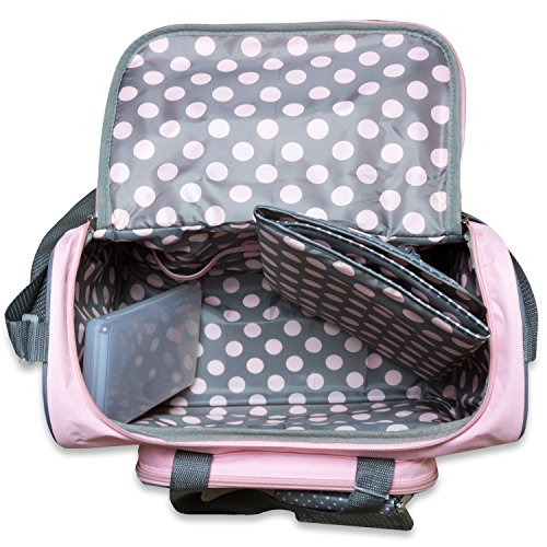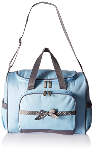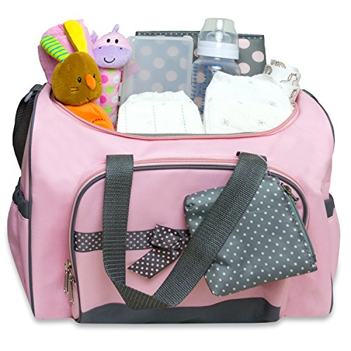 Soft hues of pink and gray come together in this stylish bag that's a delight to carry. Trimmed to perfection with touches of pink and gray polka dot ribbon, it earns high marks for fashion and function. The roomy interior holds plenty and because convenience is key, there are 4 external pockets for items you want nearby. The dotted interior and changer are wipe clean and extras include a refillable wipe case, three elastic bottle holders, two mesh pockets and a handy, printed pouch. And with an adjustable shoulder strap leaving your hands-free, it's the how to bag for traveling with baby.Feature