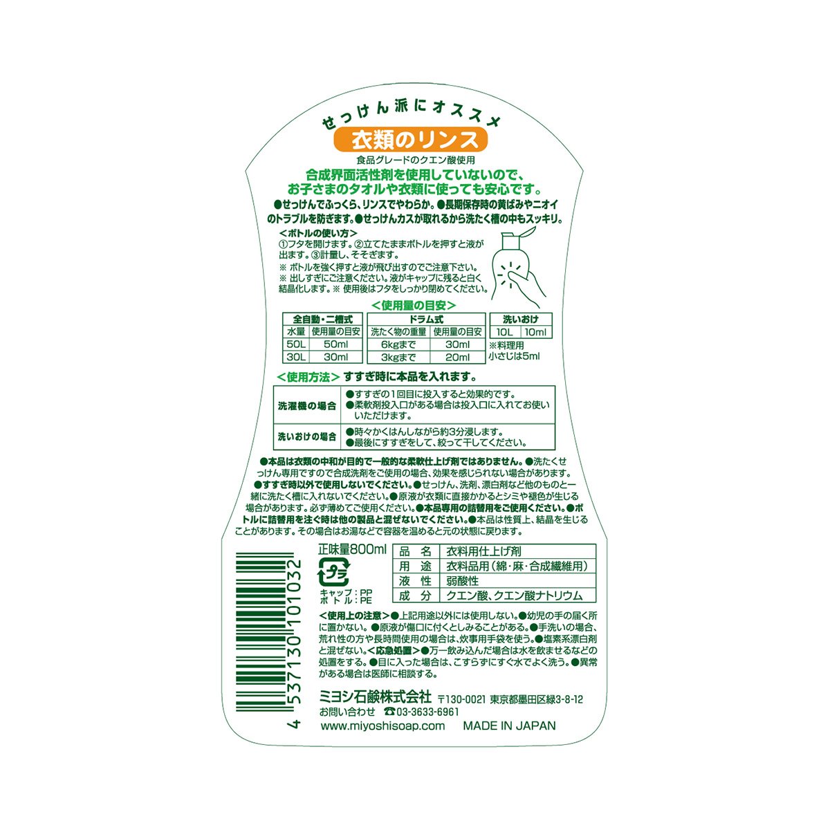 Miyoshi Soap | Fabric Softener | Rinse for Clothing 800ml