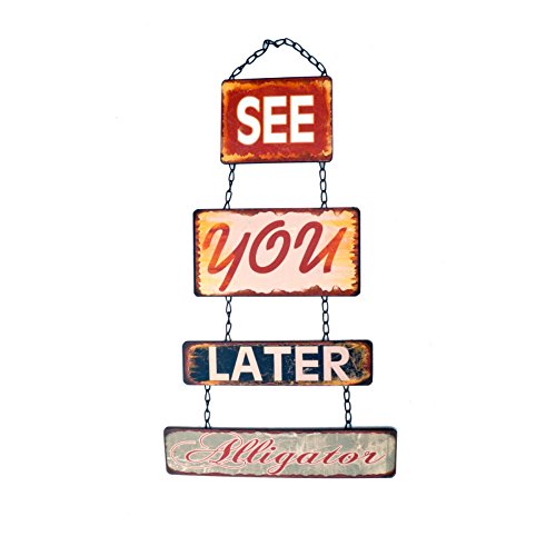 " SEE YOU LATER ALLIGATOR " Plaque ~ Wall Sign. Phrase Words in NEW RICH TONES This is a really cute sign for any home. This would make a great gift. Four tiers of distressed metal.. each sign a little different in type font and coloring.. assembled on chains for hanging. Nice quality, distressed around edges for the rustic feel. Total Measurements of the piece is 20 1/2" tall x 11"wide.. and 1/8" thick.