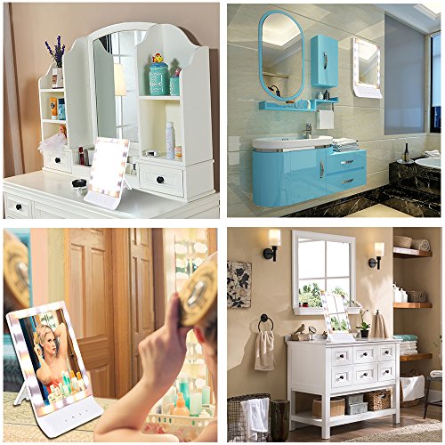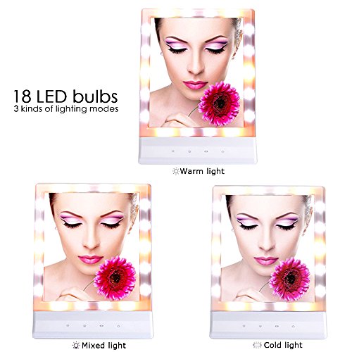 ❀3 lights modes makeup mirror: 18 pieces LED bulbs (12 cool white & 6 warm white) with 3 kinds of lights modes: Mixed light, Warm light, Cold light. You can choose different modes depending on the brightness of the lighting on different occasion, give you a beautiful makeup anytime and anywhere.