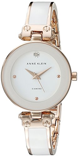 -. Binding : Watch -. Brand : Anne Klein -. Color : White/Rose Gold -. Department : womens -. EAN : 0086702570720 -. Feature : Rose gold-tone watch featuring glossy minimalist dial with dauphine hands and diamond at 12 o'clock / 34 mm rose gold-tone metal case with mineral dial window / Japanese quartz movement with analog display / Enamel-filled alloy bangle with jewelry-clasp closure / Water resistant to 30 m (99 ft): In general, withstands splashes or brief immersion in water, but not suitable for swimming -. Label : AK Anne Klein -. Manufacturer : AK Anne Klein -. Model : AK/1980WTRG -. MPN : AK/1980WTRG -. PackageQuantity : 1 -. PartNumber : AK/1980WTRG -. ProductGroup : Watch -. ProductTypeName : WATCH -. Publisher : AK Anne Klein -. Studio : AK Anne Klein -. Title : Anne Klein Women's AK/1980WTRG Diamond-Accented Dial White and Rose Gold-Tone Bangle Watch -. UPC : 086702570720