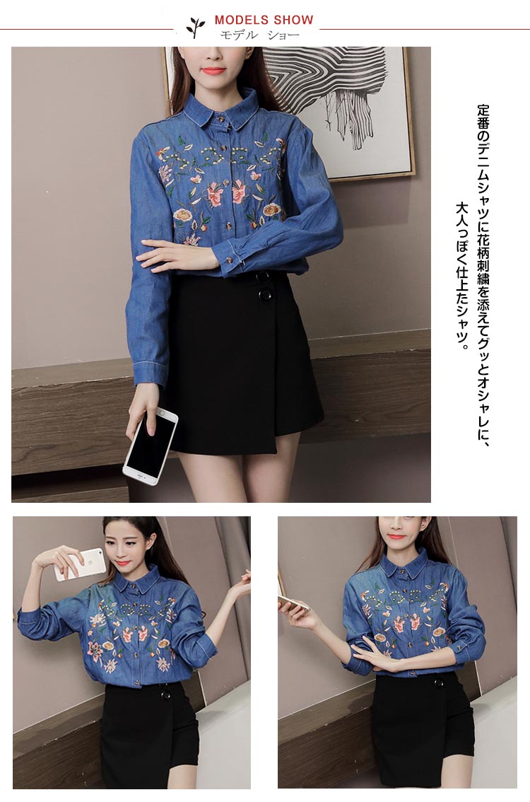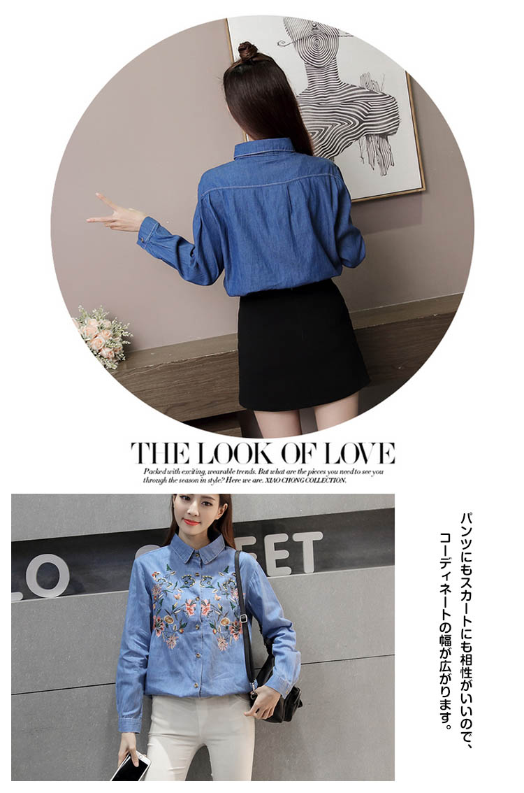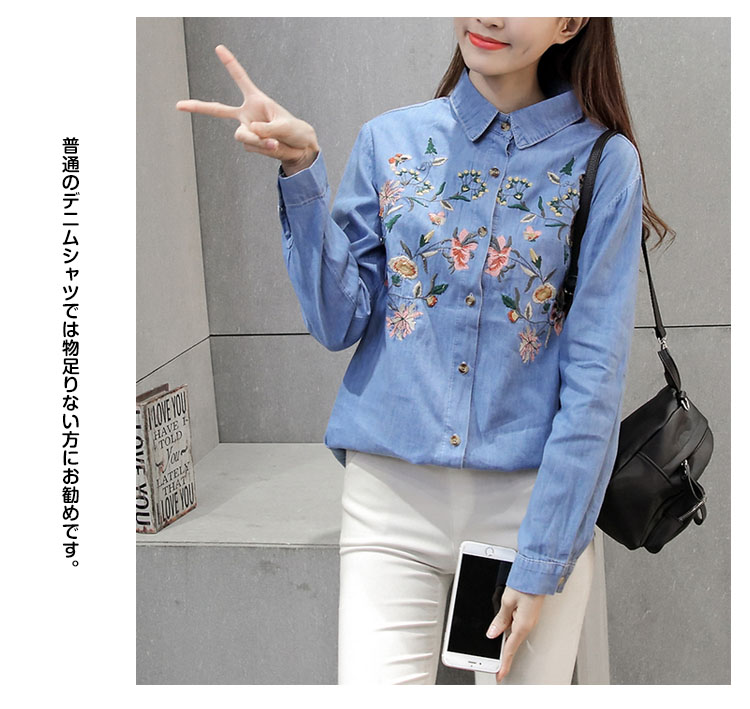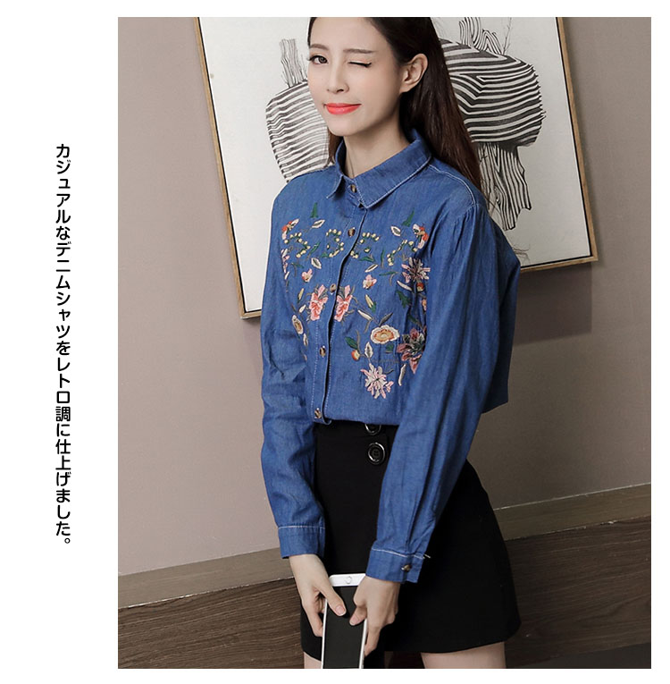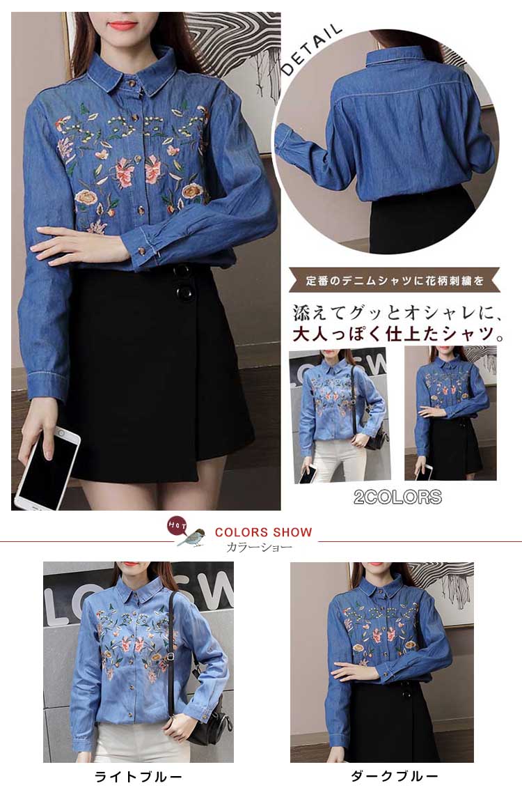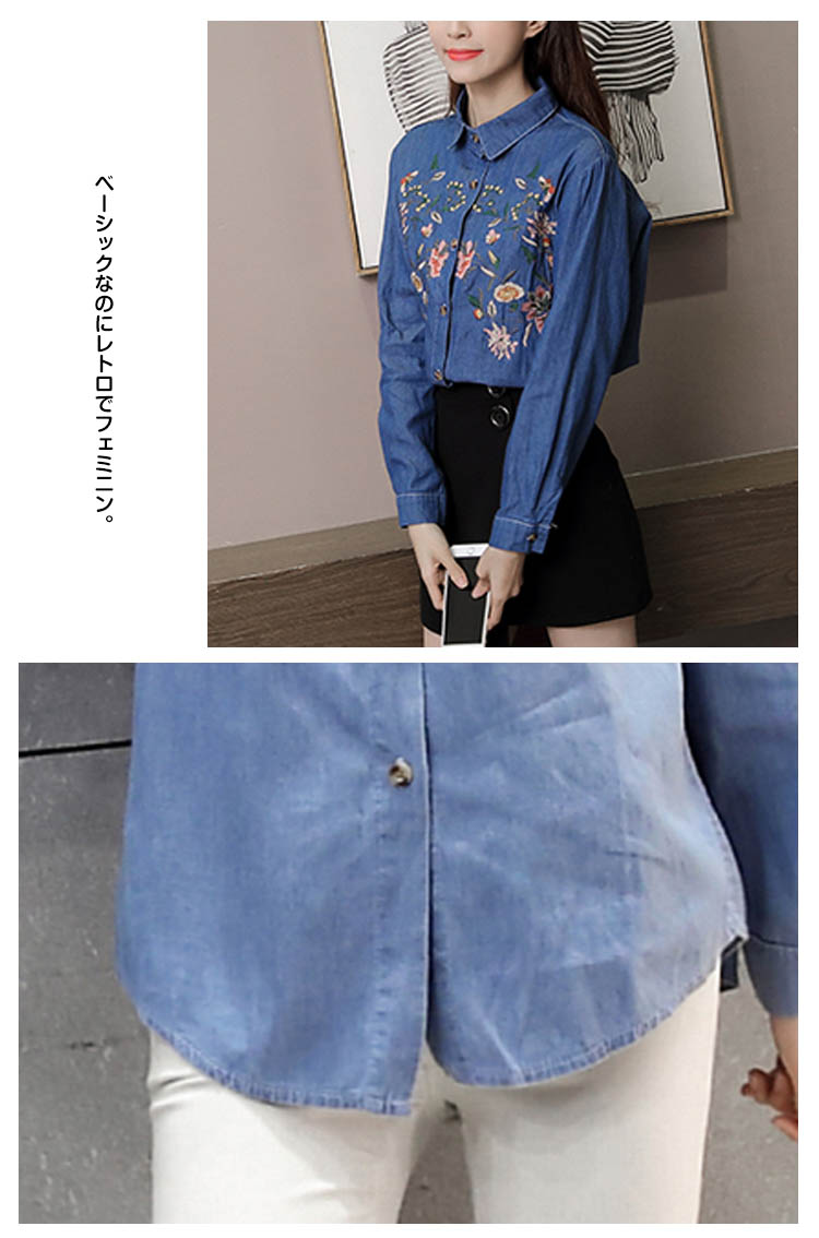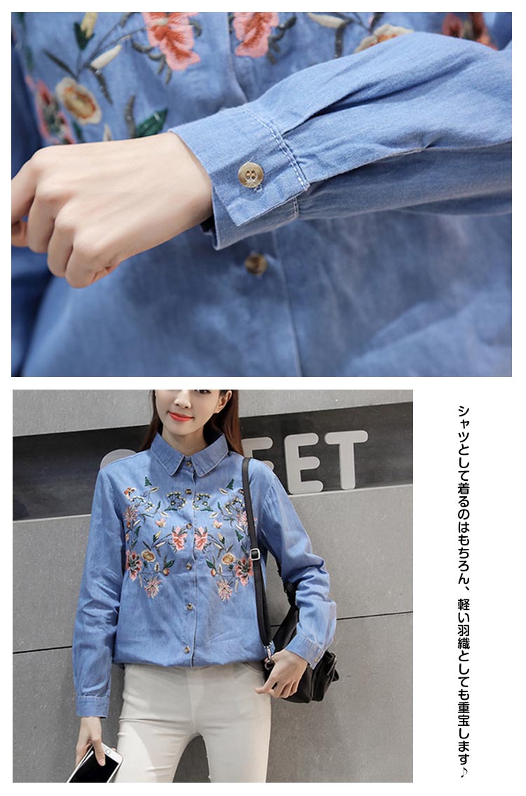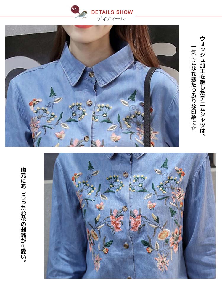 | 定番のデニムシャツに花柄刺繍を添えてグッとオシャレに、大人っぽく仕上たシャツ。カジュアルなデニムシャツをレトロ調に仕上げました。パンツにもスカートにも相性がいいので、コーディネートの幅が広がります。普通のデニムシャツでは物足りない方にお勧めです。 | |