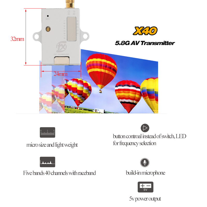 The X40-6 transmitter packs a whopping 600mW of ultra clean 5.8GHz power! A must for those who looking for longer range. The X40 is transmitting a full range of 40 channels and uses an easy way to change band by switch button.