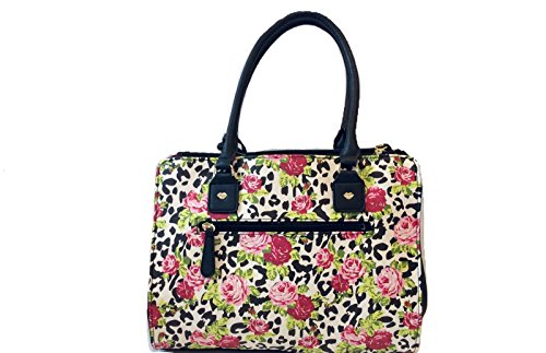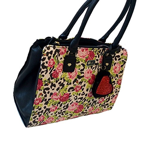 Satchel Details: Cheetah Rose design, Duel rolled handles, Puff red heart keychain, Top magnet snap closure, and 2 Top duel zip closures.