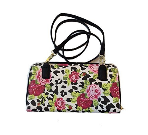 Convertible Wallet Crossbody Bag Details: Features zip around closure, Cheetah Rose design, secure mobile phone compartment, detachable crossbody strap, exterior has a front envelope magnetic snap compartment.