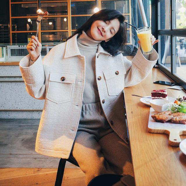 ベージュミディアム丈の秋冬コート