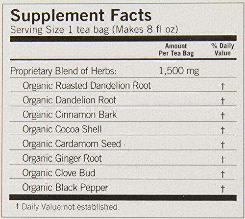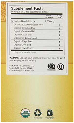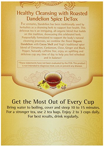 -. Binding : Grocery -. Brand : Yogi Teas -. Feature : A blend of organic dandelion with cocoa shell and the Yogi warming spice blend that helps circulate the formula within the body for optimal cleansing / 100% natural / Caffeine free / Healthy cleansing formula that helps the body detoxify by supporting the body's natural cleansing processes / For centuries, Dandelion has been traditionally used by herbalists as a cleansing herb to support liver health / Cocoa Shells and Yogi's traditional spice blend of Cinnamon, Cardamom, Clove, Ginger and Black Pepper add delicious flavor and support circulation of the formula in the body for optimal cleansing / When combined with an overall wellness program, this tea helps bring healthy balance from within / 100% organic herbal supplement made with non-GMO ingredients, Caffeine Free, Kosher, parve, no preservatives or artificial ingredients -. Label : Yogi Tea -. Manufacturer : Yogi Tea -. NumberOfItems : 6 -. PackageQuantity : 6 -. ProductGroup : Grocery -. ProductTypeName : GROCERY -. PublicationDate : 2014-02-10 -. Publisher : Yogi Tea -. ReleaseDate : 2014-02-10 -. Studio : Yogi Tea -. Title : Yogi Tea Roasted Dandelion Spice Detox, 16 Count (Pack of 6)