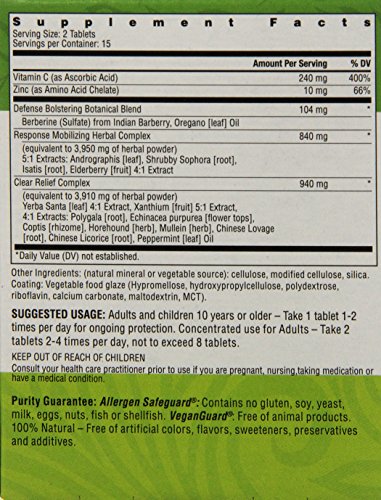 -. Feature : Activates Natural Immunity with the most potent herbal formula, delivering 3988 mg of herbal strength and the most researched herbs, including andrographis and elderberry plus Vitamin C and Zinc / Clears and Relieves Respiratory Discomfort with Xanthium, Yerba Santa, platycodon, horehound, mullein and Iceland moss / Bolsters Secondary Defenses with Berberine and organo oil / Purity guaranteed: free of gluten, soy, yeast, dairy, eggs, nuts, fish, shellfish or any animal products; 100% natural, free of artificial colors, flavors, sugar or sweeteners / Herbal IQ guarantee: ensures thorough review by qualified herbalist of selected herbs, potencies and combinations for greatest effect. Identity and purity-tested and produced in the US in our GMP-compliant facility. Formulated by Christopher Hobbs, PhD.