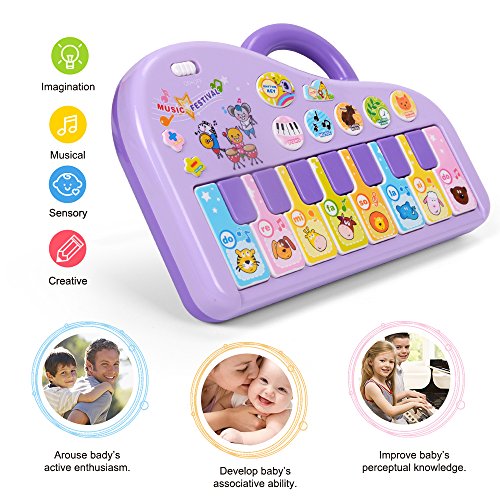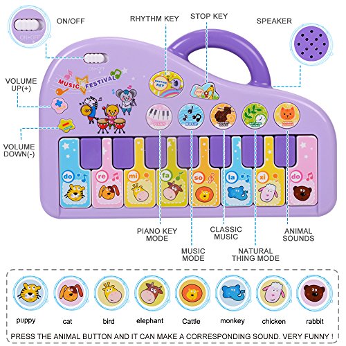 [Multiple modes]: Multiple modes: It has 5 different modes, including piano, music, classic music, natural thing and animal sounds. Especially for the animal sounds mode, children can guess the animal according to the sounds instead of following the animal images display in the keyboard.