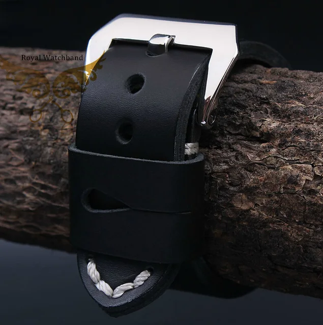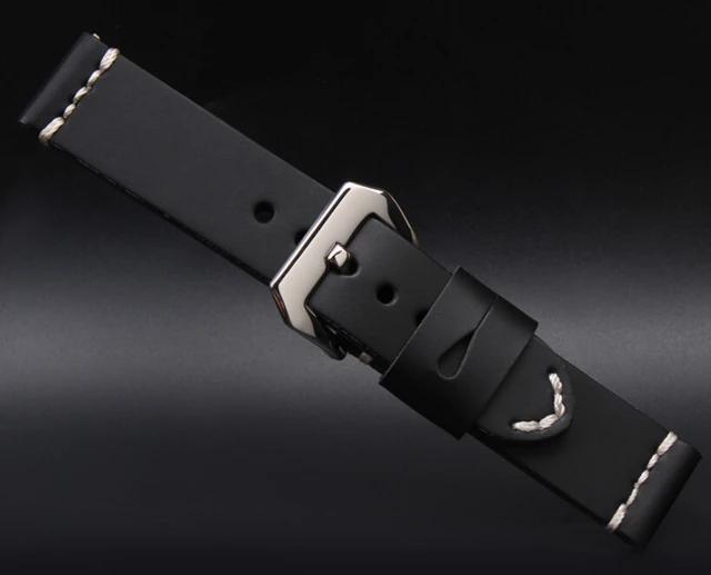 | [해외]최신 24 미리메터 프리미엄 블랙 정품 송아지 가죽 시계 스트랩 밴드 실버 광택 스테인레스 스틸 핀 버클 버클 |