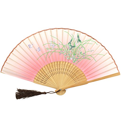 Perforated Wood Folding Fan - Green Butterfly Blossom Print Fabric - Pink