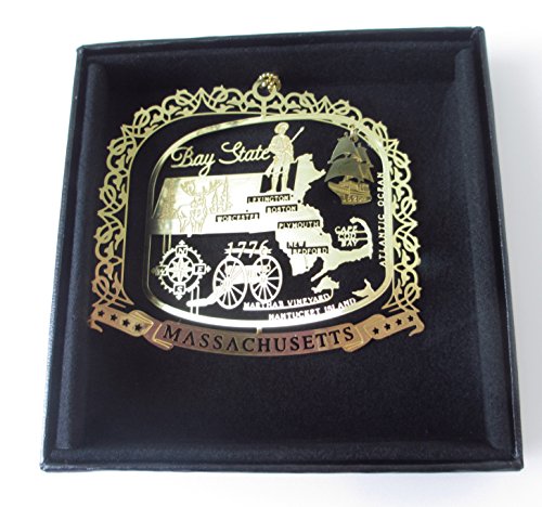 Massachusetts State Brass Christmas Ornament Black Leatherette Gift Box