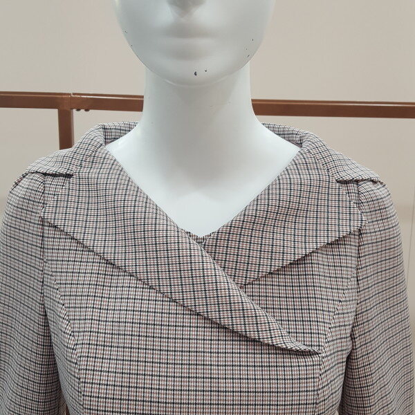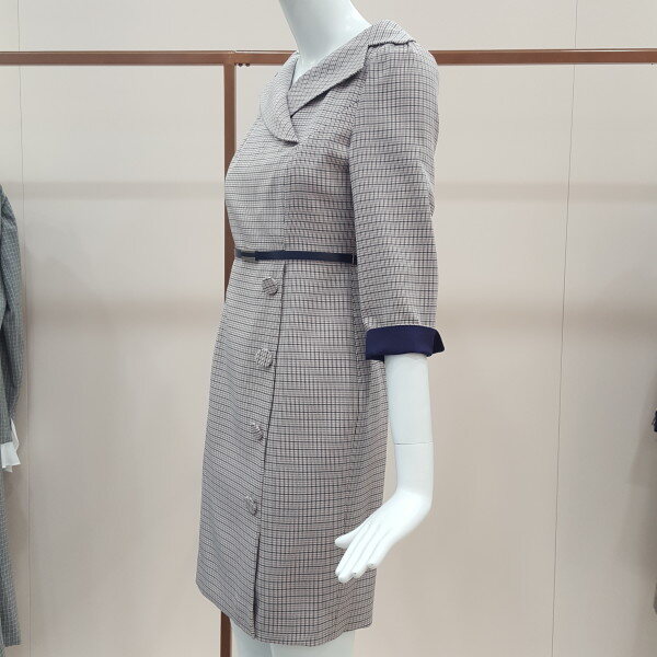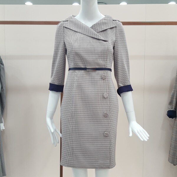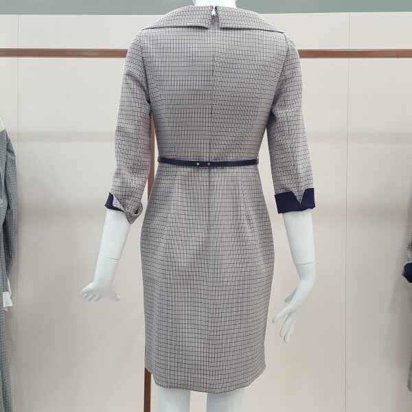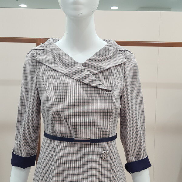 핑크와 퍼플색을 배합한 체크 원피스넥라인이 이중 처리로 고급스러움이 돋보임 7부 소매에 퍼플색이 배합되어있어 우아함을 강조함