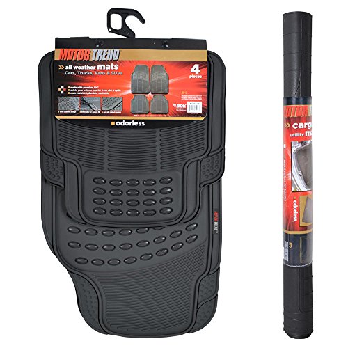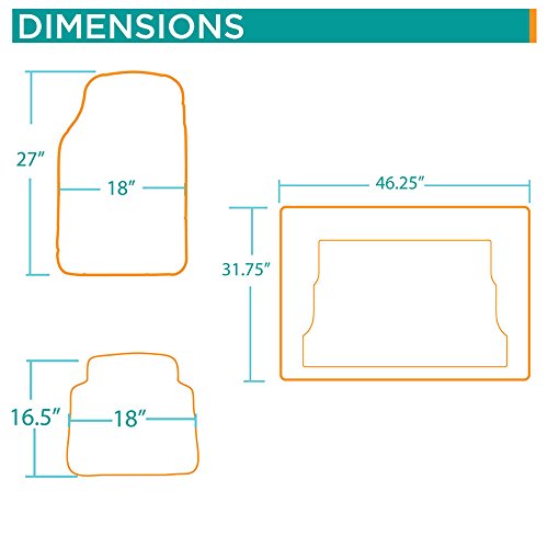-. Feature : Motor Trend Non Toxic / BPA FREE. Rubberized nibbed needle backing. / Approved by SGS European Standard. / All Weather Maximum Protection against: snow, rain, mud, gravel, dirt. Extra high ridges (Traps mud, snow, liquid easily) / Trimmable Dimensions: Front: 27" x 18" Rear: 16.5" x 18" Cargo: 46.25" x 31.75"