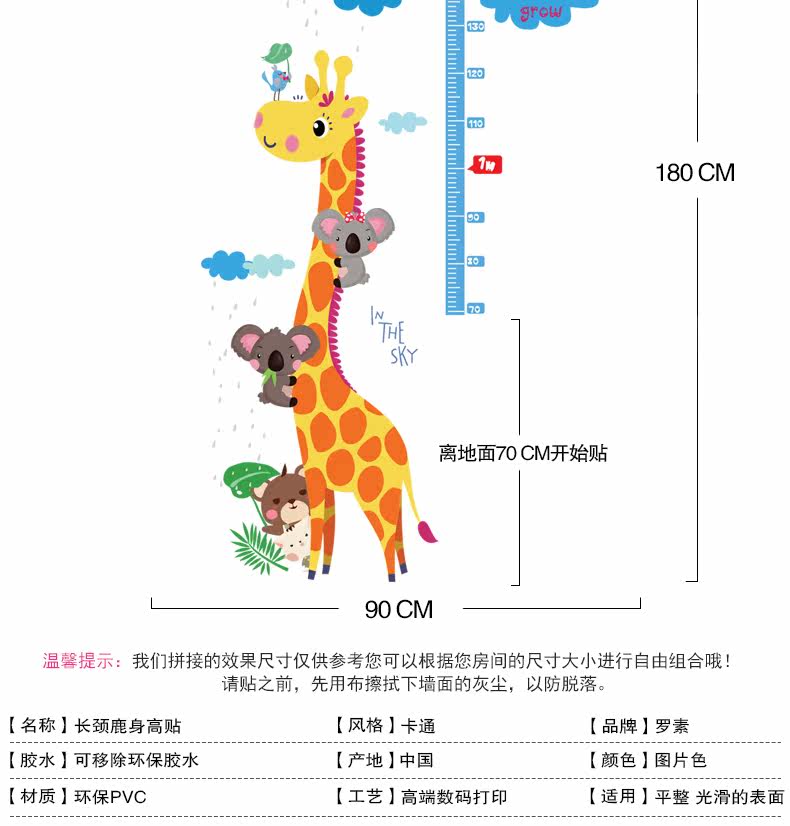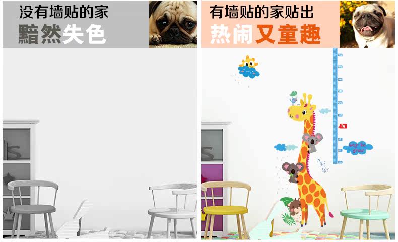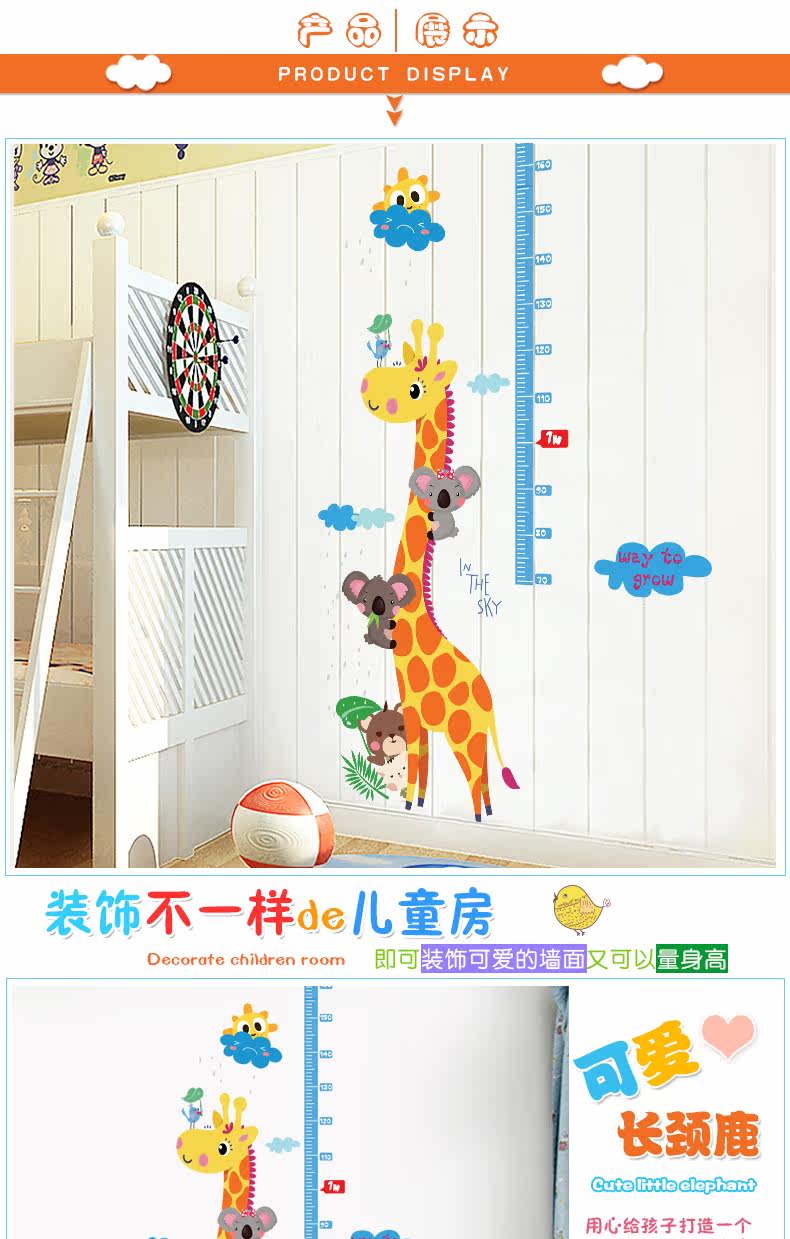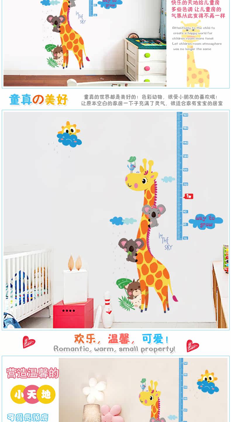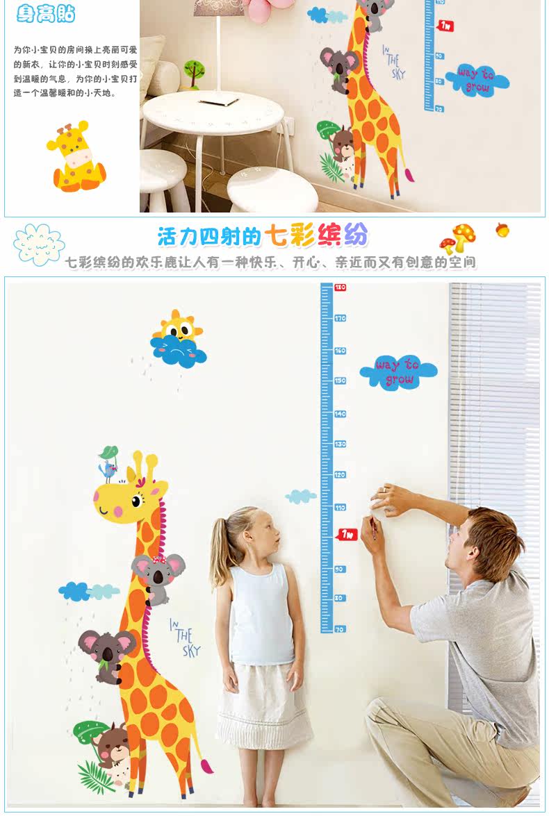 可爱长颈鹿量身高贴儿童房卡通卧室可移除墙贴幼儿园装饰墙纸贴画
