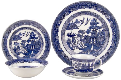 Studio : Johnson Brothers Publisher : Johnson Brothers Binding : Kitchen Product Description Blue willow by Johnson Brothers offers a romantic imagery of a legend based on two Chinese lovers. Deep blue on white the pattern features intricate double borders with a combination of geometric detailing for a fabric like texture. The central imagery depicts a Chinese landscape with bridges, a river, trees, and houses. Two doves reincarnations of the fugitive lovers hover above the scene. Durable for everyday use and can go in the dishwasher, freezer, and microwave. This set includes: dinner, salad, cereal bowl, teacup and teasaucer. 0