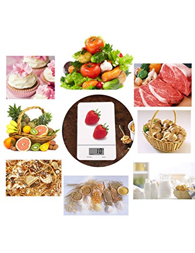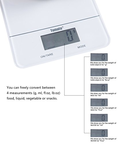 - UNIT CONVERSION: It can freely convert between 4 measurements (g, ml, fl:oz, lb:oz) and displays results on the LCD screen. Our digital food scale also has a capacity from 11lbs (5kg) to 0.002lbs (1g) with the food, liquid, vegetable or snacks.