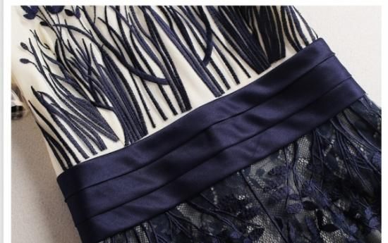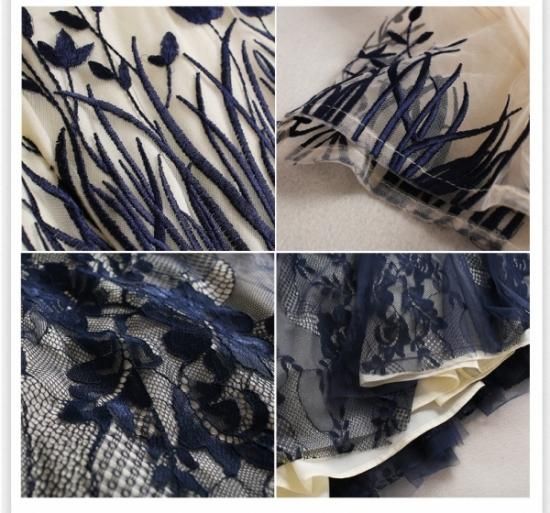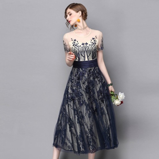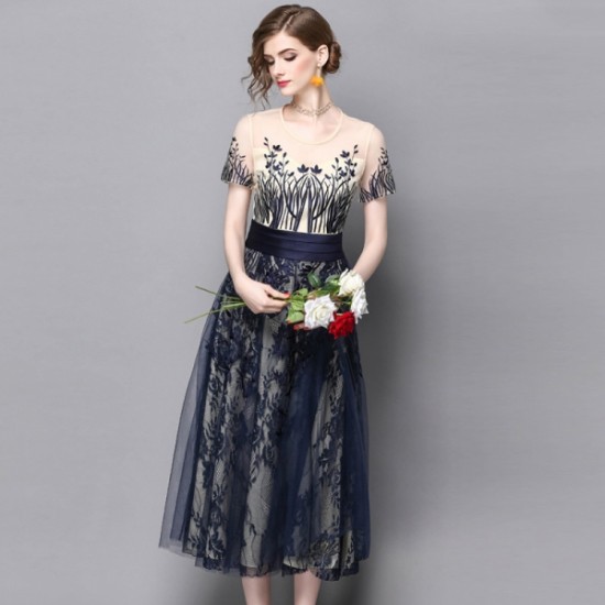 パーティードレス ミモレ丈 ワンピース 半袖 シースルー 花柄刺繍 フレア ウエストマーク お呼ばれ ネイビー drgz2588