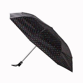 -. Binding : Misc. -. Brand : Totes -. EAN : 0018227537131 -. Feature : Fun pattern; this umbrella comes with a black background and multicolored polka dots / 56 INCHES BIG: The canopy is big enough to keep multiple people dry on a windy or rainy day. / NO LEAKS GUARANTEED: This canopy is made from 100% polyester that is guaranteed to be leak-proof. / WINDPROOF CONSTRUCTION: The umbrella features a sturdy, engineered frame that is designed to be wind resistant. / AUTO OPEN UMBRELLA: The automatic open mechanism allows easy one-handed operation. -. IsAutographed : 0 -. IsMemorabilia : 0 -. Label : Totes -. Manufacturer : Totes -. ProductGroup : Sports -. ProductTypeName : SPORTING_GOODS -. Publisher : Totes -. Studio : Totes -. Title : Totes 25-Ounce Stormbeater, Automatic Double Vented Folding Umbrella, 56-inch Canopy, Polka Dot, 1-pack -. UPC : 018227537131