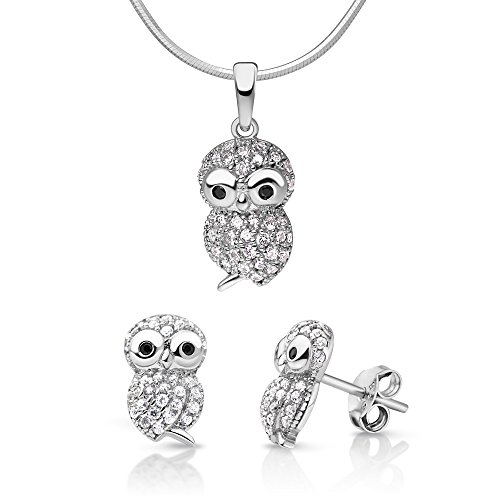 -. Title : Sterling Silver Cubic Zirconia CZ Little Owl Birds Jewelry Set - Earrings and Pendant Necklace 18"