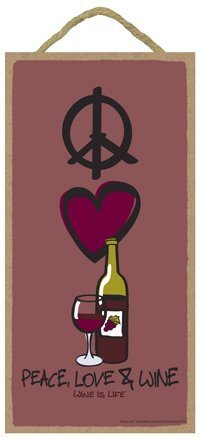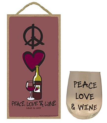 5"x10" Peace, Love & Wine Wood Plaque and 17 oz Stemless Wine Glass