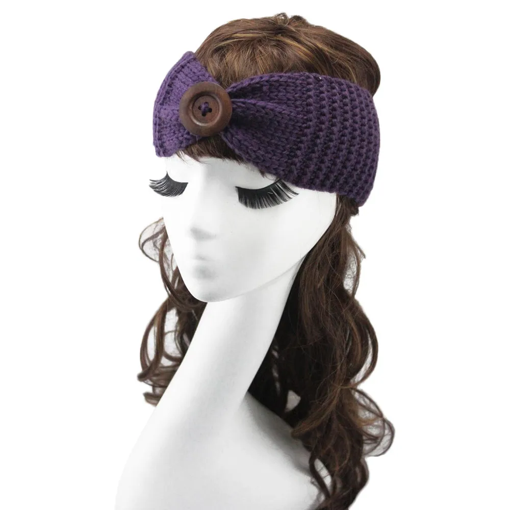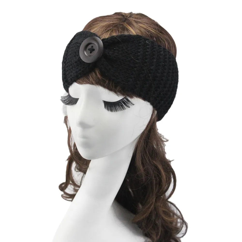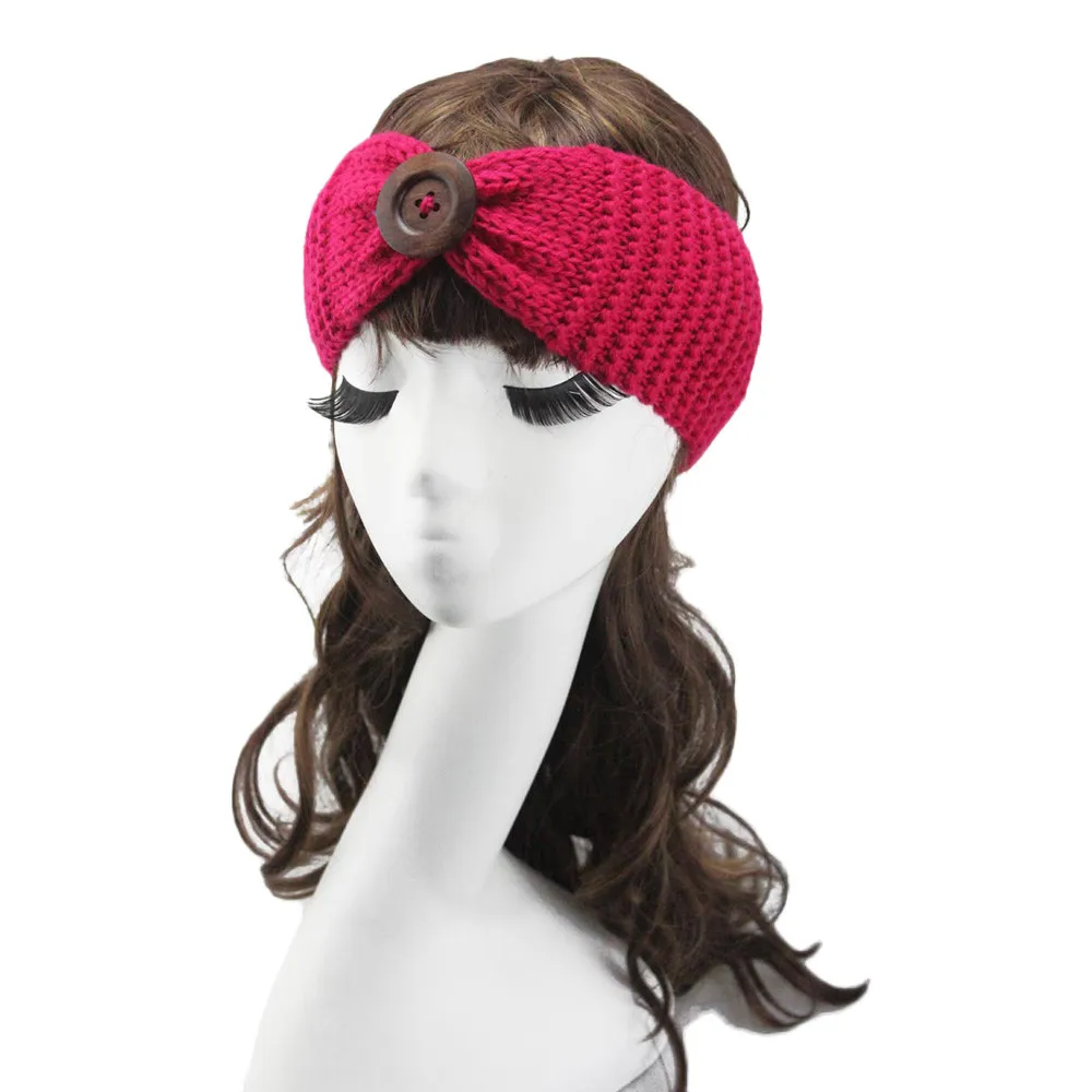 Women Knitted Headband :Crochet Bow Button Stretch Knit Hairband