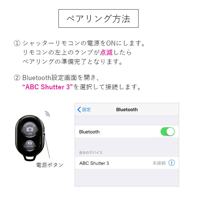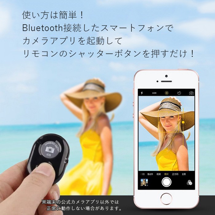 | ・スマホ本体のBluetoothをオンにし、リモコンの電源もオンにします。 「Shutter Camera」と一覧に表示されるので接続をします。 ・連携アプリをダウンロードしていない場合、中央の写真撮影ボタンのみ使用が可能です。 ・アプリをダウンロードし連携させて使用していただきますと、他の機能も使用可能となります。 ・動画撮影の場合 左上、ビデオマークで動画撮影に切り替わり、中央カメラマークで撮影が始まります。 停止する場合はもう一度中央カメラ部分を押すと撮影が終了します。 ・中央カメラシャッターのみの使用ならスノーや加工されている他のカメラアプリでの使用も可能です。 |