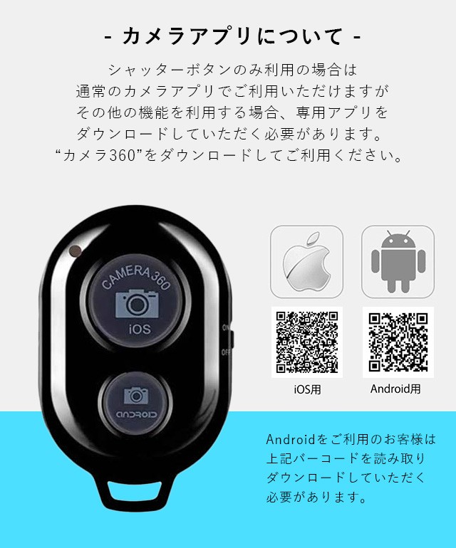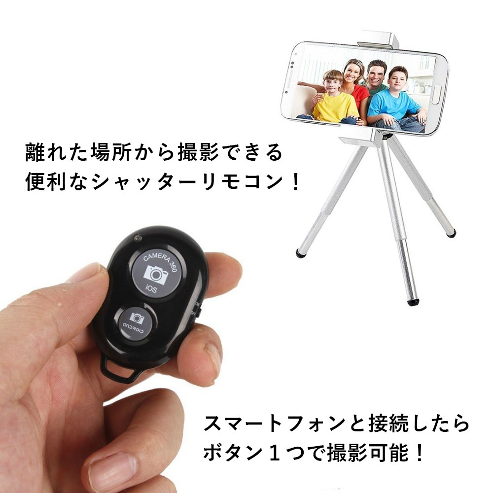 サイズ縦5cm×横3.5cm×厚さ1cm機能カメラ反転 動画撮影 写真撮影 ズームイン ズームアウト対応機種Android 4.2.2 又は最新バージョンIOS 6.0 又は最新バージョン例)iPhone8 iPhoneX iPhone7 Plus iPhone X SE iPhone6 Android 対応 Ipad 2, 3, 4, Mini, Mini 2, Air; Samsung Galaxy S3, S4, S4 Mini, S5, S5 Mini, Note 2, Note 3 etc..付属品リチウムバッテリー2個使用方法・スマホ本体のBluetoothをオンにし、リモコンの電源もオンにします。「Shutter Camera」と一覧に表示されるので接続をします。・連携アプリをダウンロードしていない場合、中央の写真撮影ボタンのみ使用が可能です。・アプリをダウンロードし連携させて使用していただきますと、他の機能も使用可能となります。・動画撮影の場合左上、ビデオマークで動画撮影に切り替わり、中央カメラマークで撮影が始まります。停止する場合はもう一度中央カメラ部分を押すと撮影が終了します。・中央カメラシャッターのみの使用ならスノーや加工されている他のカメラアプリでの使用も可能です。セルカ棒 シャッターリモコン 自撮り 自撮り棒 iPhone カメラシャッター スマートフォン