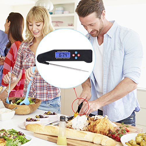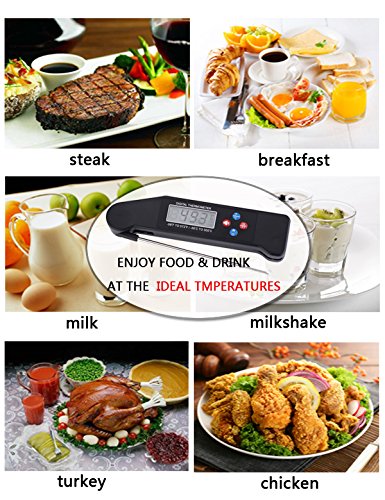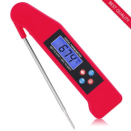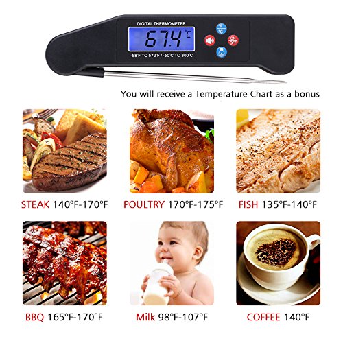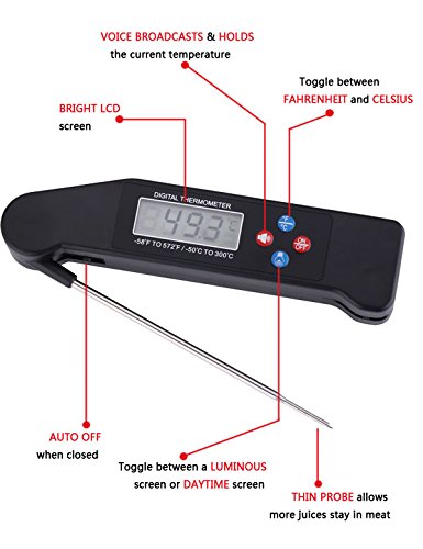 -. Feature : ¡¾INSTANT READ¡¿Instant Reading Thermometer gets temp readout in 5 seconds with high precision sensor, 304 Stainless steel probe. / ¡¾WIDE TEMPERATURE RANE¡¿Cooking Thermometer with temperature range of -58¡ãF to 572¡ãF(-50-300¡ãC). Display resolution: 0.1oC (0.1oF). Celsius/Fahrenheit switchable; Perfect for indoor outdoor cooking, grilling, BBQ and so on. / ¡¾TALKING AND LED NIGHT FUNCTION¡¿Get the temperature by voice or clear LCD light screen, which is visible and readable in dim hours and dark spots. Whether you are out for a night BBQ or in your kitchen, you can turn on the bright blue back-light or push the voice button to have it spoken to you. / ¡¾CERTIFIED PRODUCT¡¿It has long antibacterial probe with size of 10.6*0.9*1.41 inches which will keep you away from dangerous and stay safe. Kitchen Thermometer with foldable probe design folds away easily and locks into base for portability and storage. / ¡¾AUTO SHUTOFF¡¿The Meat Thermometer Comes with a 10-minute Automatic Shut off Features which Prevents Accidentally Running the Battery down, or it can shut off when you closed the probe.