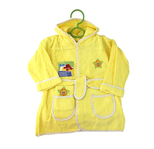 -. Feature : Consists of 100% cotton terry for the softest and most comfortable feel on baby's tender skin / Features an attached tie in front to keep the robe wrapped snugly and securely around your child and to prevent accidentally losing the tie. / Comes in bright colors with eye-catching Sesame Street designs and a cute polkadot trim and is sure to bring happiness to your child / Includes a soft terry hood for added warmth, comfort, and protection for your child after bathing / Very absorbent and warm, the ideal accompaniment for bath time, and the perfect addition to any new family