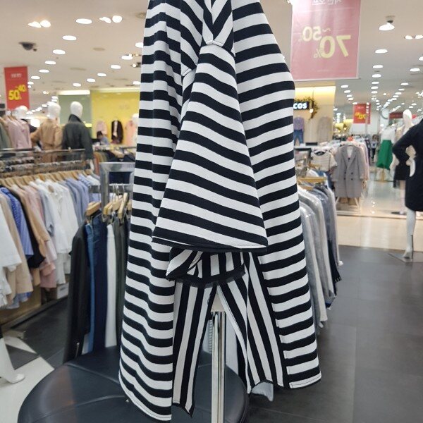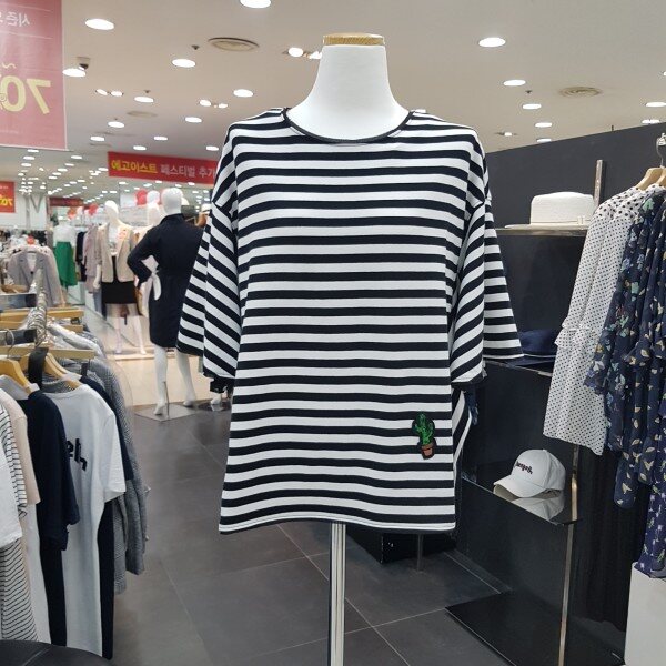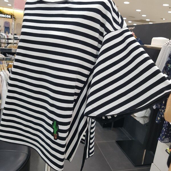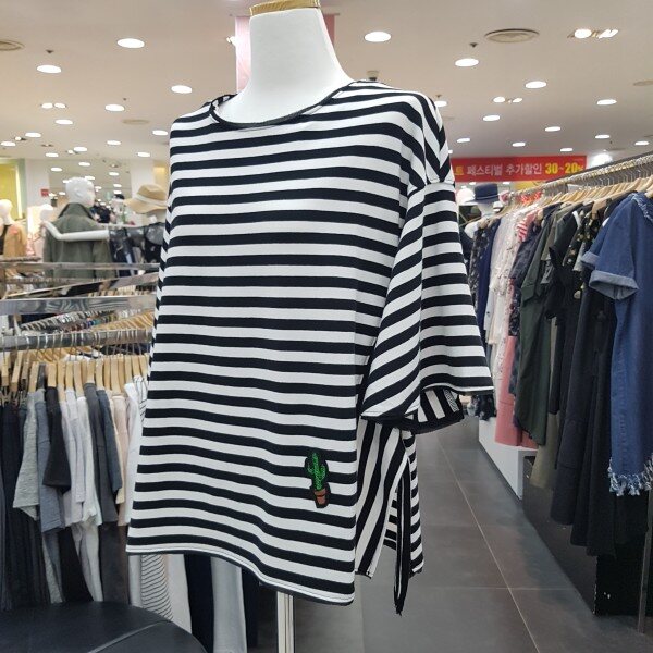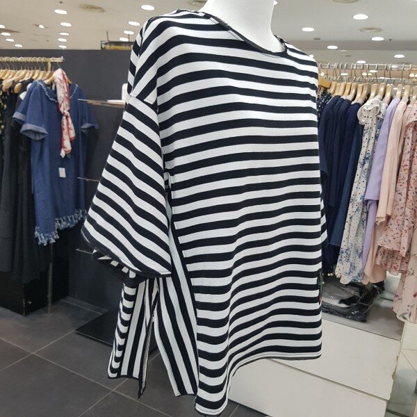 루즈핏의 사이드 슬릿 포인트가 있는 스트라이프 티셔츠 입니다러플 소매와 플레어 라인으로,체형커버에도 좋으며 목선과 소매 밑단이 쉬폰으로 테이핑 처리로 여성스러움이 더한 제품 입니다