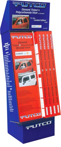 The Putco element tinted window visors POP display can be used as either a floor display or hung on any wall. The full color display assembles in minutes and includes live product.