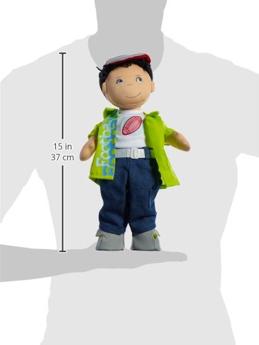 -. Feature : HABA's classic Steven has embroidered eyes, freckles and dark chenille hair under his sporty grey cap. Steven is wearing a t-shirt under a button-up shirt, trousers, belt, baseball cap and shoes with Velcro. / His soft body is sturdy enough to withstand rough play from children 18 months and up, yet still soft for cuddling and carrying. He has beanbag bottom so he can sit on his own. / A great toddler doll, Steven is hand washable with cold water (do not spin dry). Arrives in a closed gift-box. / A great addition to any child's lovable doll collection.