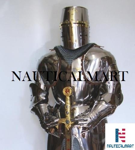 Product Description Medival Knight Suit of Armor Wearable Costume Authentic Reproduction Replica ARMOUR Size - 6 FEETIn Beautiful FinishMade Of Good Quality Steel18gauge Steel The suit of armour was worn over regular underclothesand was attached to the wearer using leather straps and buckles. IT was used to protect areas that could not be protected with plate armor. Suit of armor usually consists of the helmetbreastpate backplate gaunlets, pauldrons (or spaulders), vambraces,couters, sabatons (foot armor), greaves (to protect shins)and gorget, sometimes called a neckguard. Suits of armour had various uses. COLLECTIBLE, REPLICA, MEDIEVAL ARMOUR, RE-ENACTMENT, LARP, FANTASY COSTUMEIt will come with FREE######### Wooden stand, Wooden Base as per all the items show in our image 0